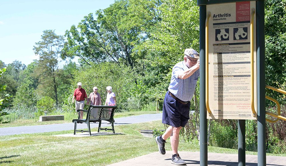 Senior residents walking along the rail trail and using the exercise station.