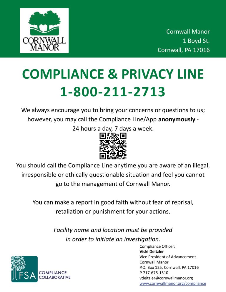 Cornwall Manor is a leader in the senior living industry and has a reputation for providing high-quality housing, healthcare and related services. Cornwall Manor’s high standards of honesty, integrity, impartiality and ethical conduct ensure the retention of trust in our organization. Preserving that trust and maintaining our reputation requires close observance of these standards by the Cornwall Manor Board of Trustees, Officers, employees, physicians, vendors/contractors, volunteers and other agents. We are committed to providing exemplary senior care, operating under the highest ethical and moral values and complying with applicable legal requirements.