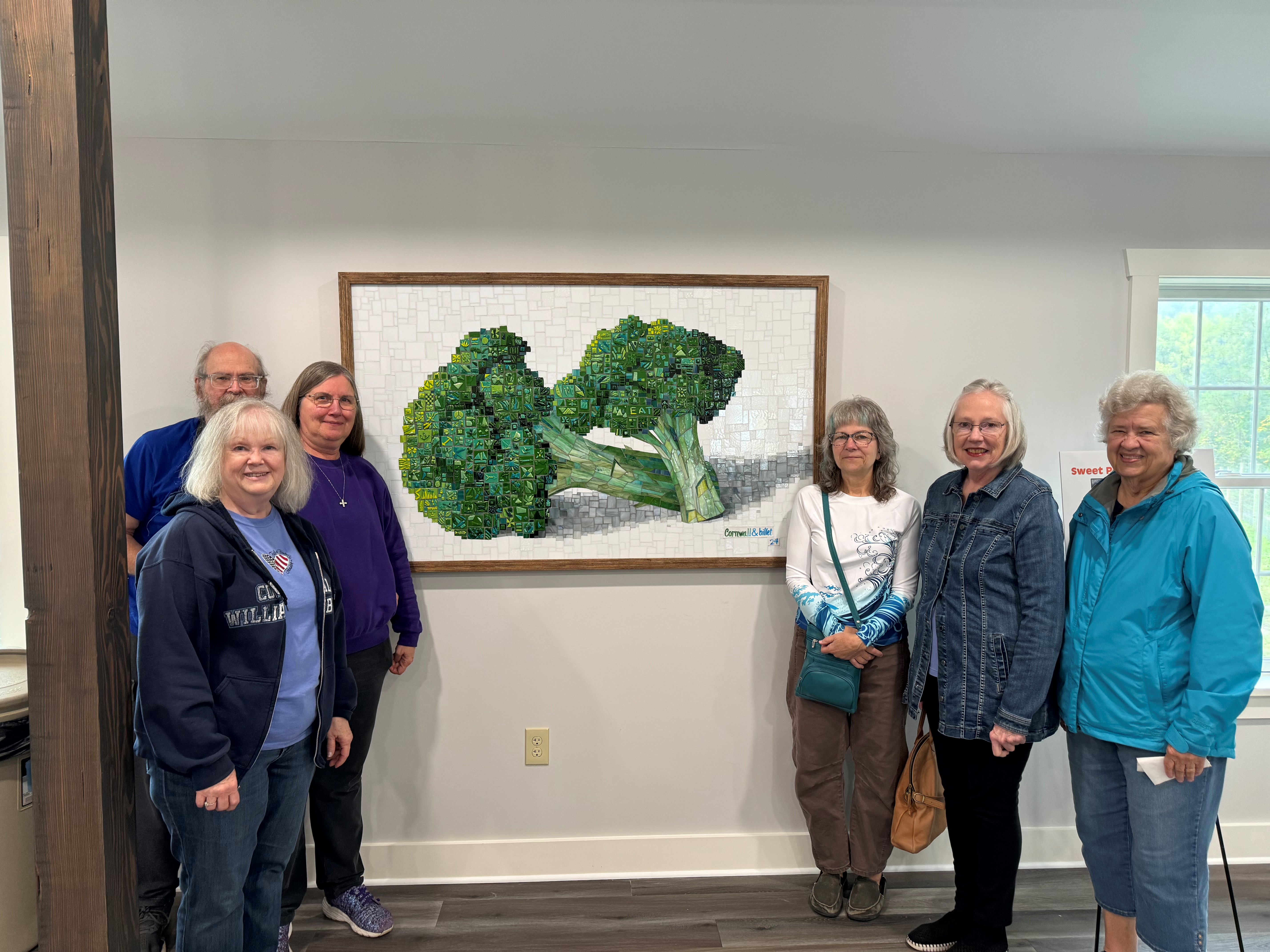 Residents stand with professional teaching artist Linda Billet (third from right) with a communal art piece completed in 2023. Residents crafted smaller tiles and Linda put them altogether to form a broccoli. The piece hangs at the Trailside Organic Farm to show the relation between organic produce grown at our onsite organic farm.